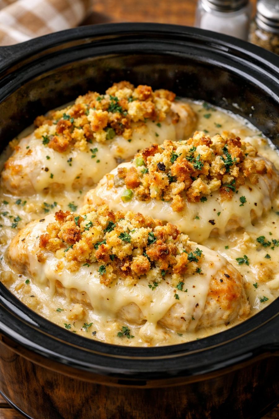 Once done, let the dish rest, covered, for about 5–10 minutes to allow the sauce to thicken slightly. Serve the chicken breasts topped with some of the creamy sauce and softened stuffing from the slow cooker.