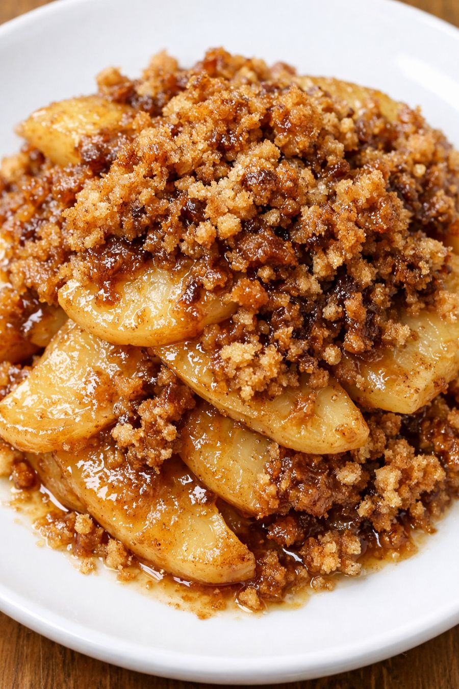 Layer the apples and crumbs: Spread about one-third of the sliced apples in an even layer on the bottom of the slow cooker. Sprinkle one-third of the buttery crumb mixture over the apples, covering them as evenly as you can. Repeat these layers two more times, ending with a generous layer of crumbs on top.