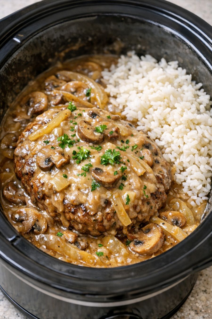 This slow cooker 4-ingredient onion smothered steak is the kind of weeknight recipe I lean on when I want something deeply savory with almost no effort. It’s modeled after the old-school Midwestern trick of using dry onion soup mix as an instant flavor booster—salty, oniony, and loaded with umami. You simply lay raw round steak in the slow cooker, spread the dry onion soup mix over the top, add just two more pantry ingredients, and let low, gentle heat transform a tougher cut into fork-tender comfort food. It’s the sort of dish that quietly bubbles away all afternoon and then disappears faster than anything else on the table.