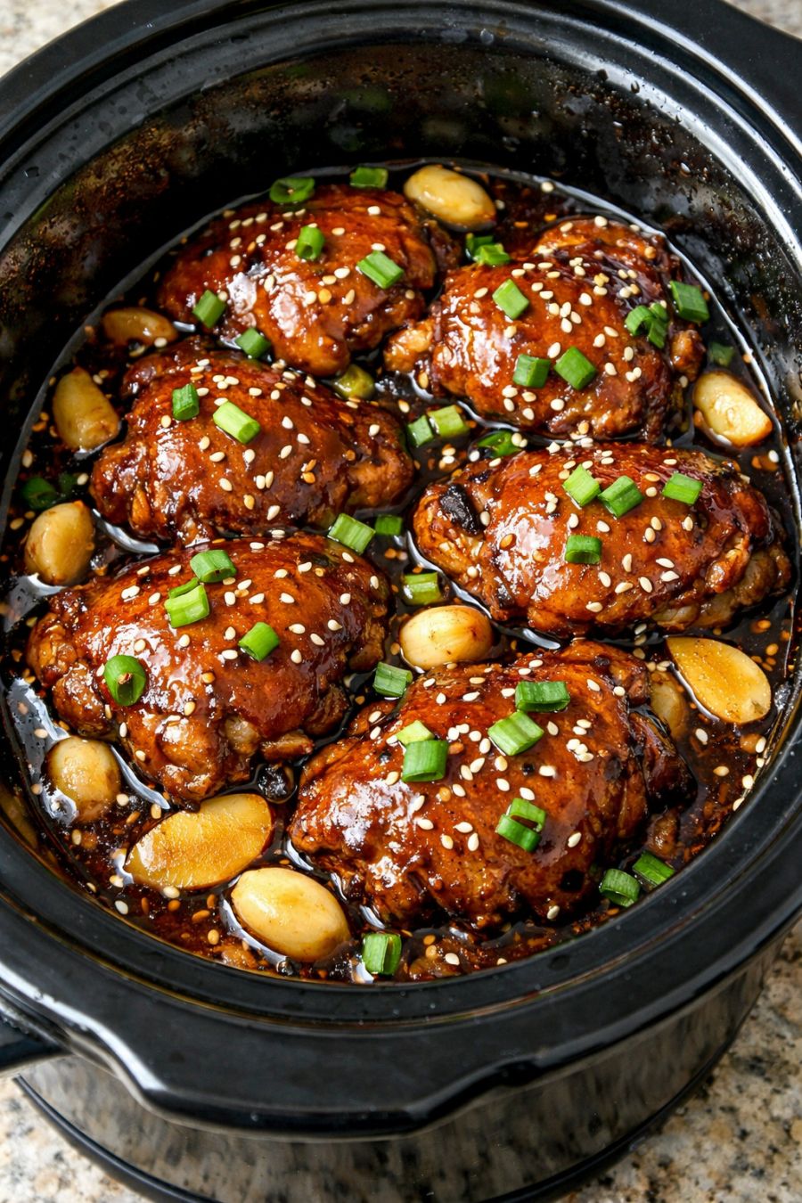 For a spicier version, whisk 1 to 2 teaspoons of chili-garlic sauce, sriracha, or a pinch of red pepper flakes into the honey garlic mixture before drizzling it over the chicken. If you prefer boneless, skinless chicken thighs, use the same weight and reduce the cooking time slightly—start checking at about 3 1/2 hours on LOW or 2 hours on HIGH, as boneless pieces cook faster and can dry out if left too long. To lean more into a teriyaki-style profile, swap the rice vinegar for mirin (a sweet Japanese rice wine) and add a teaspoon of grated fresh ginger to the sauce. If you want a more robust, molasses-like sweetness, replace a couple of tablespoons of the honey with brown sugar. For a sheet-pan adaptation, place the raw chicken thighs on a foil-lined baking sheet, drizzle with the same sauce, and roast at 400°F (200°C) for 30 to 40 minutes, basting once or twice, until cooked through and caramelized at the edges. Leftovers keep well for up to 3 days in the refrigerator and are excellent shredded and folded into fried rice, tucked into tacos with crunchy cabbage, or layered onto sandwiches with pickled vegetables for contrast.
