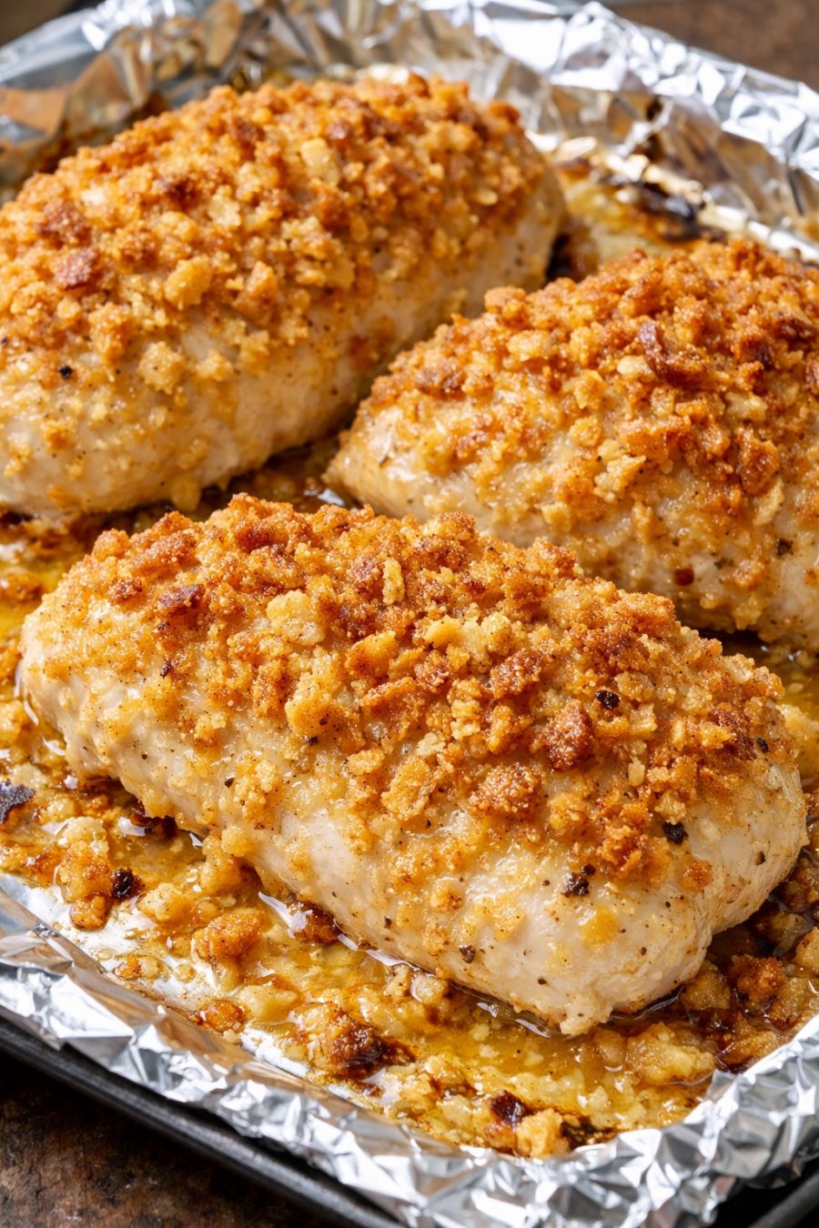 Remove the baking sheet from the oven and let the chicken rest on the pan for about 5 minutes. This helps the juices settle and the cracker crust firm up. Serve warm, spooning any buttery crumbs from the foil over the top if you’d like.