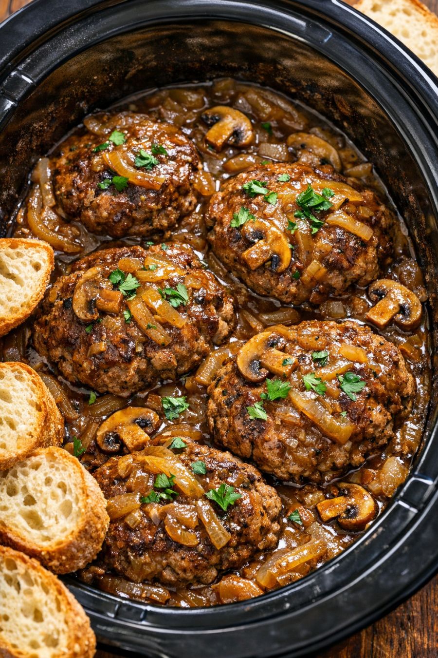 Cover the slow cooker with the lid and cook on LOW for 6–7 hours, or on HIGH for 3–4 hours, until the patties are cooked through and very tender, and the sauce has thickened into a rich onion gravy.