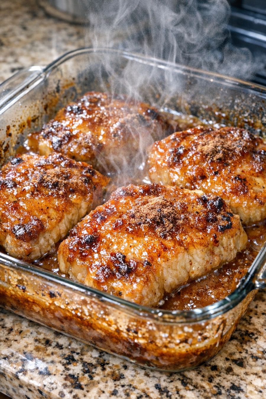 Remove the baking dish from the oven and let the pork chops rest for about 5 minutes. Spoon some of the warm applesauce from the pan over each chop before serving. Serve hot with your favorite sides, making sure to share plenty of that sweet, cinnamon-kissed sauce.