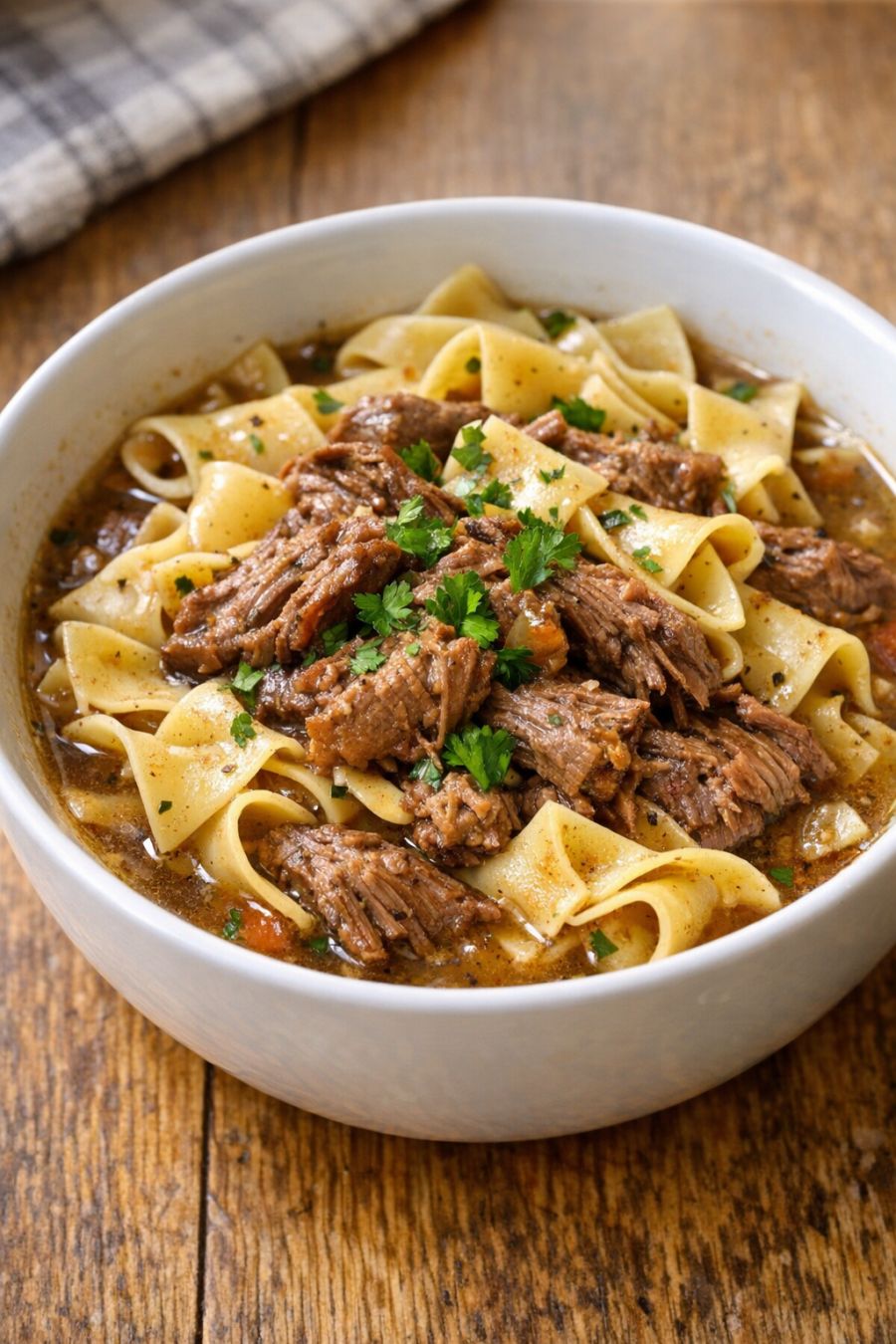 Serve these beef and noodles in wide, shallow bowls so the tender meat and silky noodles have room to soak up every bit of the savory broth. They’re wonderful ladled over a scoop of mashed potatoes or alongside buttered corn and steamed green beans for a classic Midwestern plate. A simple tossed salad and a basket of warm dinner rolls or buttered toast help round out the meal. For a cozy touch, sprinkle a little black pepper on top at the table and offer sliced pickles or a crisp coleslaw for a bit of crunch against the soft, comforting noodles.