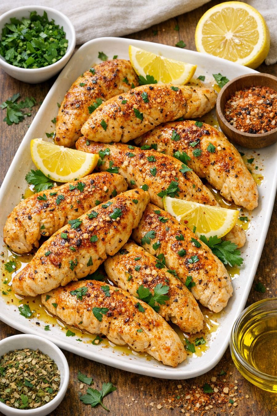 Return the pan to the oven and bake for another 10–15 minutes, or until the chicken is cooked through, lightly crisped on the edges, and the internal temperature reaches 165°F (74°C). Thinner tenders will cook faster; thicker ones may need the full time.