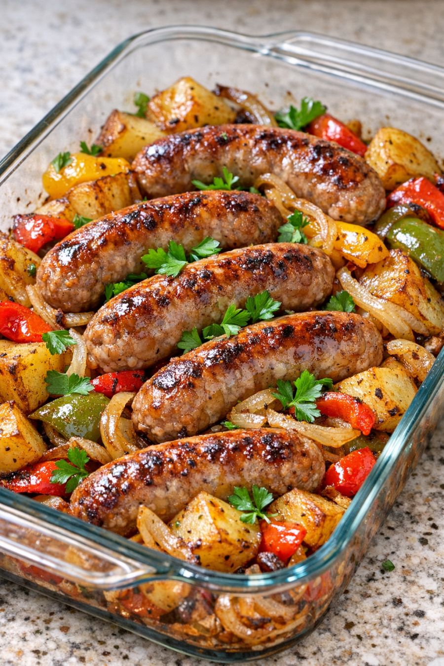 Remove the foil, gently stir the veggies around the sausages, and return the dish to the oven. Bake uncovered for another 20–25 minutes, stirring the vegetables once more halfway through, until the sausages are nicely browned and cooked through (internal temperature should reach 160°F/71°C) and the potatoes are tender when pierced with a fork.