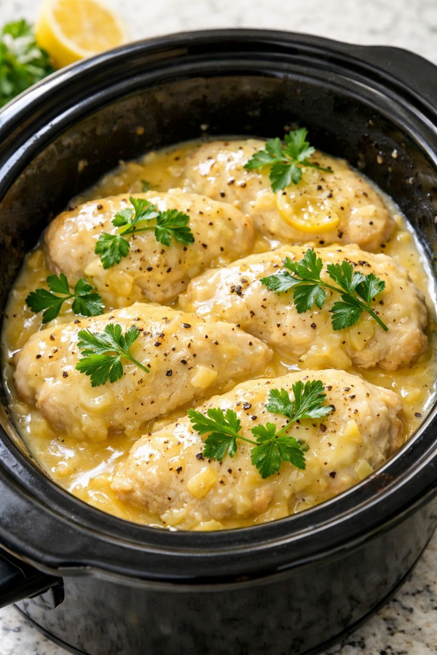 If you prefer a milder lemon flavor, start with 1/4 cup lemon juice and add a splash more at the end if needed. For a little extra color, sprinkle paprika or additional dried parsley over the top before cooking (these are optional and not part of the core 4 ingredients). You can swap one can of cream of chicken soup for cream of mushroom or cream of celery to change the flavor while keeping the same simple method. If your chicken breasts are very thick, consider cutting them in half lengthwise so they cook more evenly and soak up more of the sauce. For a richer, creamier finish, stir in a small splash of heavy cream or a spoonful of sour cream at the end of cooking, off the heat. Leftovers reheat well; shred the chicken completely and use it in sandwiches, over baked potatoes, or tucked into tortillas with a bit of shredded lettuce for an easy next-day meal.