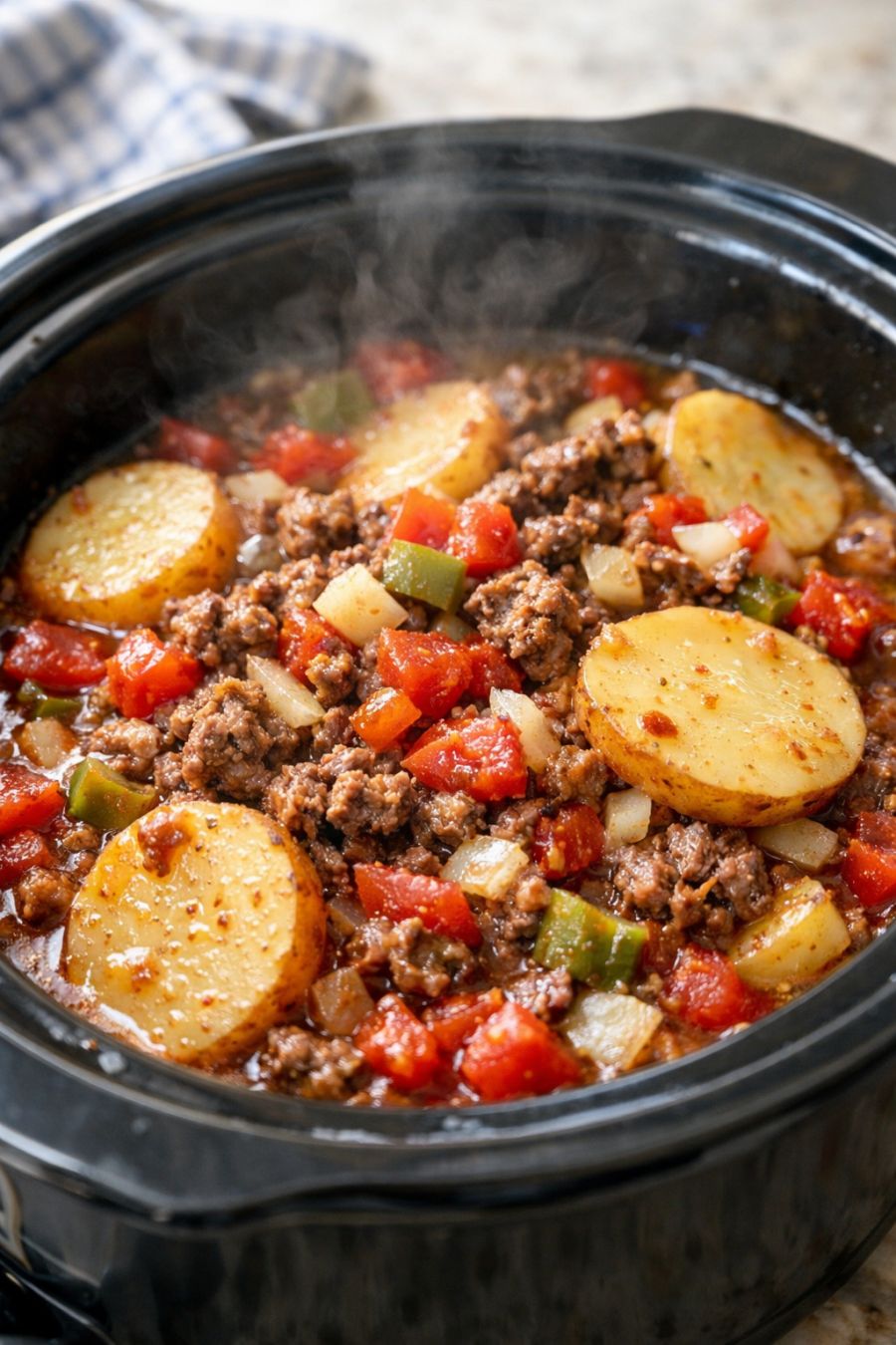 Cover the slow cooker with the lid and cook on LOW for 6 to 8 hours, or on HIGH for 3 1/2 to 4 hours, until the potatoes are tender and the ground beef is fully cooked through.