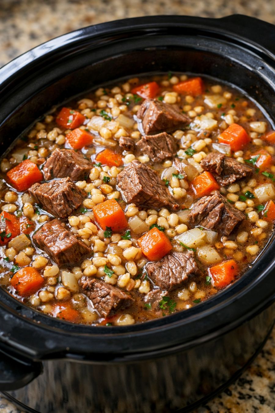 Cover the slow cooker with the lid and cook on LOW for 8–10 hours or on HIGH for 4–5 hours, until the beef is very tender and the barley is soft and plump.