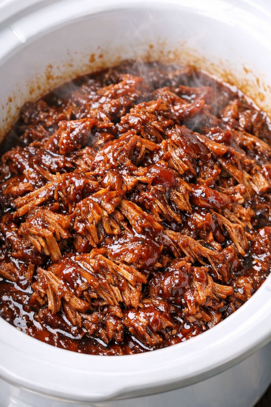 Return the sauced, shredded pork to the slow cooker and stir it into any remaining juices. Spread it out in an even layer so you get those glossy, saucy mounds of meat. Cover and cook on LOW for another 20–30 minutes, just until everything is hot and the sauce has thickened slightly and clings to the pork.