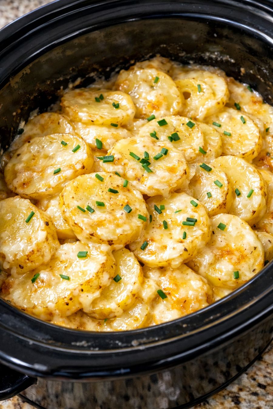 Rest and thicken: Once the potatoes are tender, turn the slow cooker to WARM and let the dish sit, covered, for 15 to 20 minutes. This short rest helps the sauce thicken slightly and cling to the potatoes, giving you that ultra-creamy, scalloped texture instead of a runny sauce.