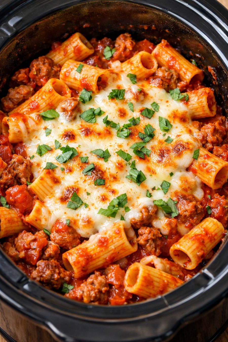 Give the rigatoni a gentle stir to mix in some of the melted cheese while leaving a little on top for looks. Taste and add salt or pepper if needed. Serve hot, straight from the slow cooker.