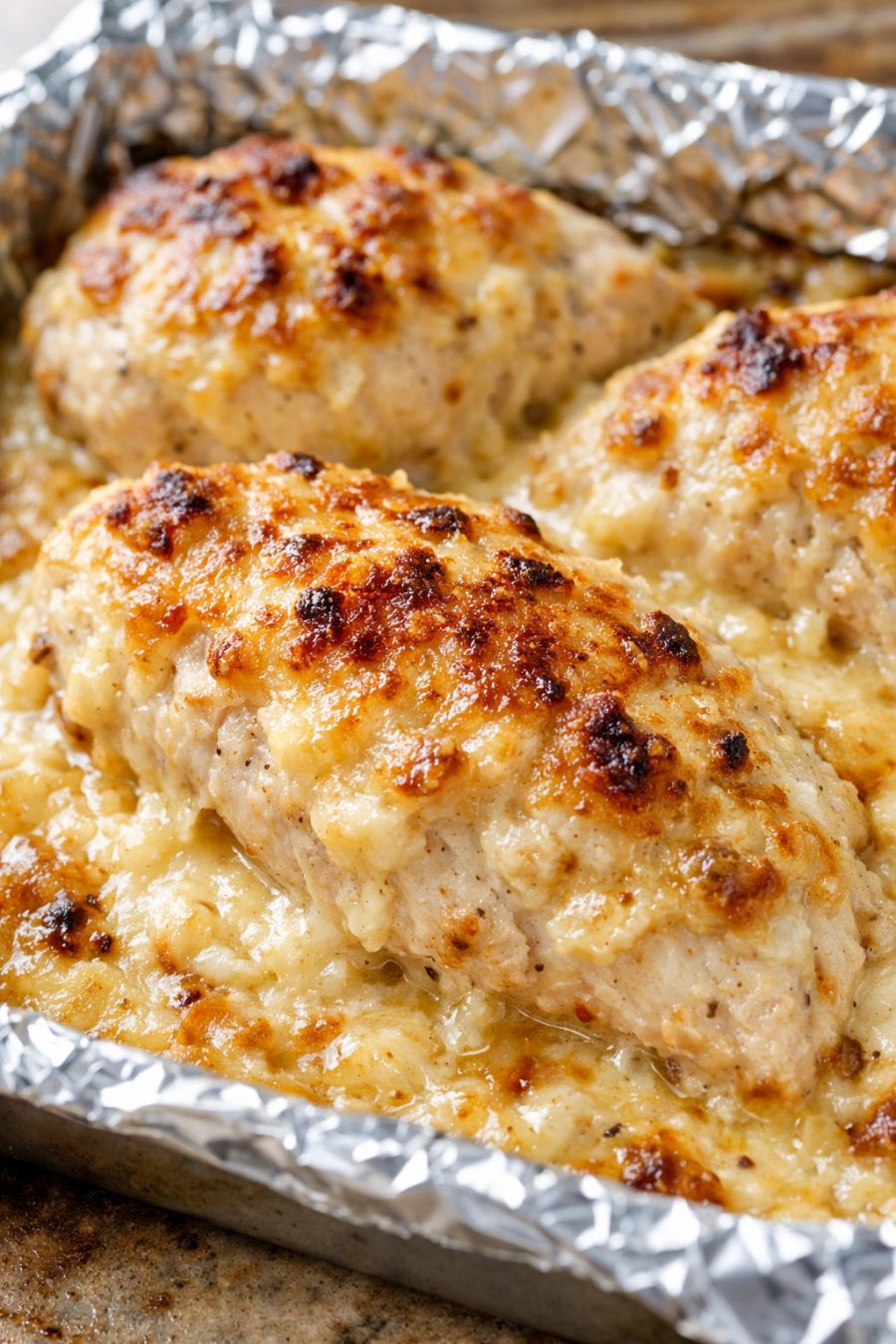 Remove the pan from the oven and let the chicken rest on the sheet for about 5 minutes. The creamy coating will settle into a sauce around the chicken. Serve the chicken straight from the foil-lined pan, spooning some of the creamy sauce over each piece.