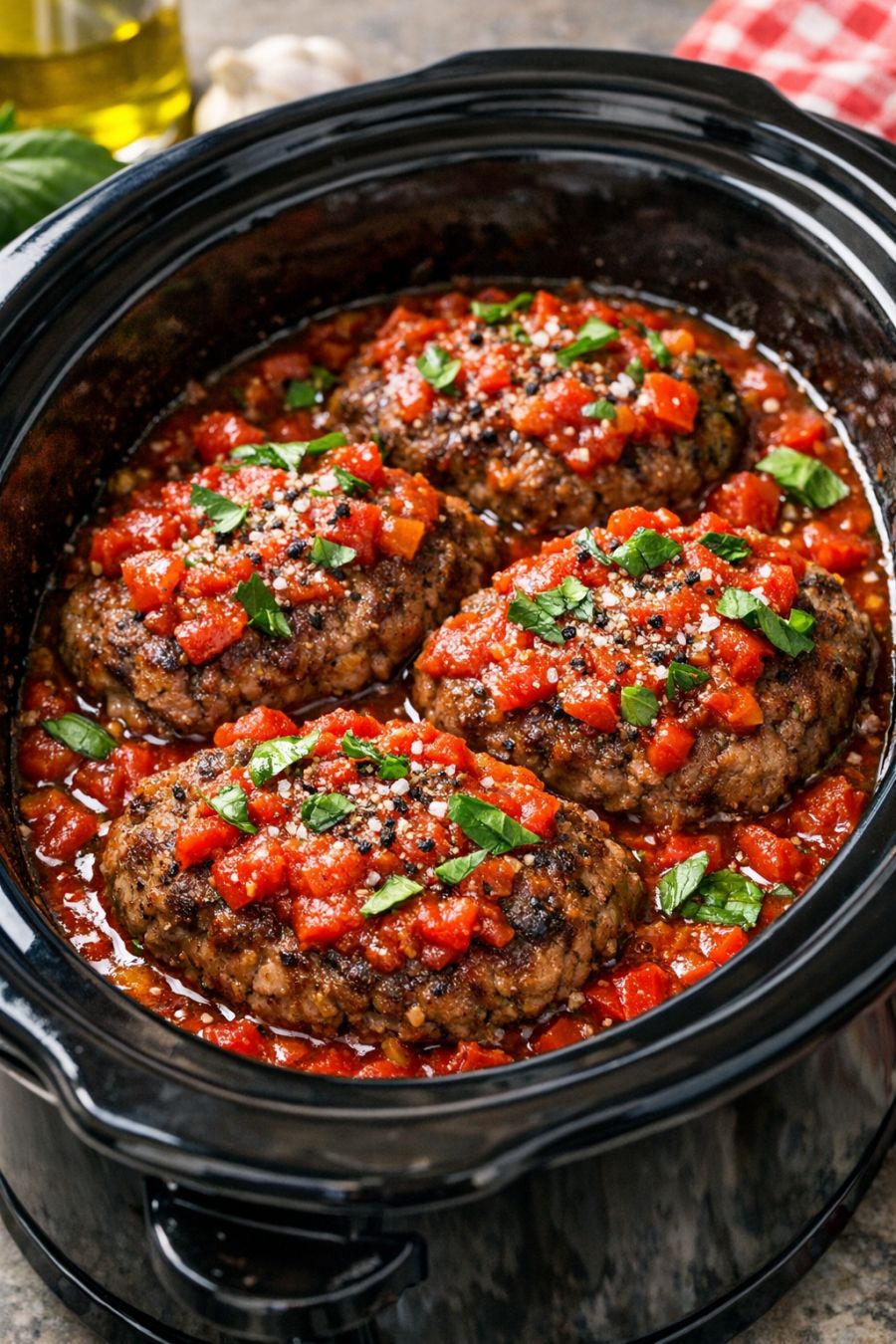 To lighten this up a bit, you can swap in ground turkey or a 50/50 mix of ground beef and ground turkey; just keep the patties on the thicker side so they don’t dry out. If you love extra basil flavor, add a handful of fresh basil at the very end of cooking for a brighter, more herby taste. For a slightly sweeter sauce, stir 1 teaspoon of sugar or a splash of balsamic vinegar into the diced tomatoes before spooning them over the patties. If you want more vegetables without more work, scatter a layer of sliced onions or bell peppers under the raw patties before you add the tomatoes—they’ll cook down and blend into the sauce. You can also turn this into a hearty sandwich night by serving the burger steaks on toasted buns with a slice of provolone or mozzarella; just spoon the tomatoes over the cheese so it melts. For meal prep, shape the patties the night before and keep them in the fridge; in the morning, all you have to do is drop them into the slow cooker, spoon over the tomato mixture, and turn it on before you head out the door.