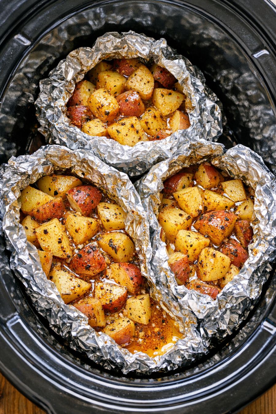 Seal the packets: Bring the long sides of each foil sheet up over the potatoes and fold them together tightly, then roll and crimp the ends to seal. You want snug, well-sealed packets so the steam and butter stay inside and the slow cooker stays clean. Shape them into compact bundles that will fit easily into your slow cooker crock.