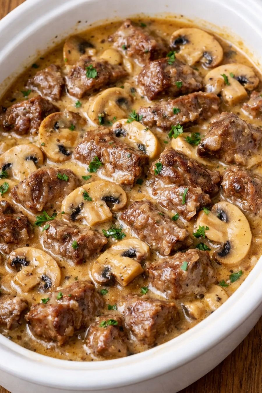 Cover the casserole dish tightly with a lid or a double layer of aluminum foil. This helps keep the moisture in so the beef turns out tender and the sauce stays creamy instead of drying out.