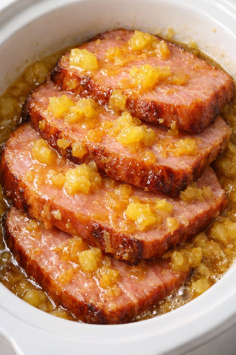 Slice the ham into thick slices. Return the slices to the slow cooker, nestling them back into the warm pineapple glaze so they’re coated and stay moist until serving.