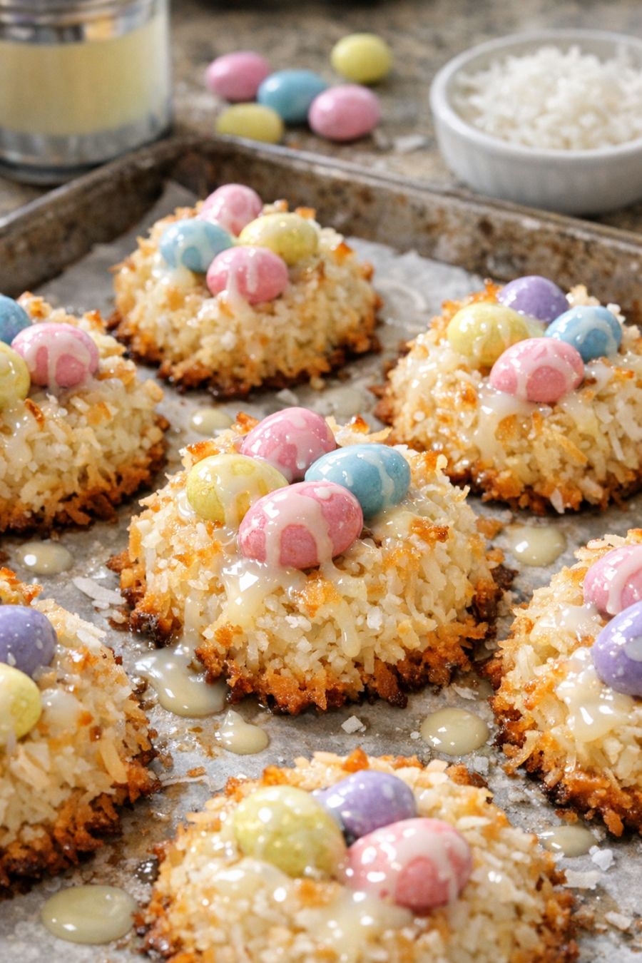 For a chocolate drizzle, melt 1/2 cup chocolate chips in the microwave in 20-second bursts, stirring in between, and drizzle over the cooled macaroons, then let them set before serving. To dial back the sweetness, swap half of the sweetened shredded coconut for unsweetened shredded coconut; the texture stays similar but the overall bite is less sugary. If you don’t have pastel candy-coated chocolates, use regular mini chocolate chips or chopped chocolate bars and add a few pastel sprinkles on top for that Easter vibe. You can also add 1 teaspoon of vanilla or almond extract to the slow cooker mixture before cooking for extra flavor without adding another “main” ingredient. For a crisper edge, pop the scooped macaroons under the broiler on a parchment-lined baking sheet for 1 to 2 minutes, watching closely, just until the tops get lightly toasted. If you’re meal-prepping ahead of a busy holiday weekend, make the macaroons a day or two early and refrigerate; bring them back to room temp before serving so the centers are nicely chewy.