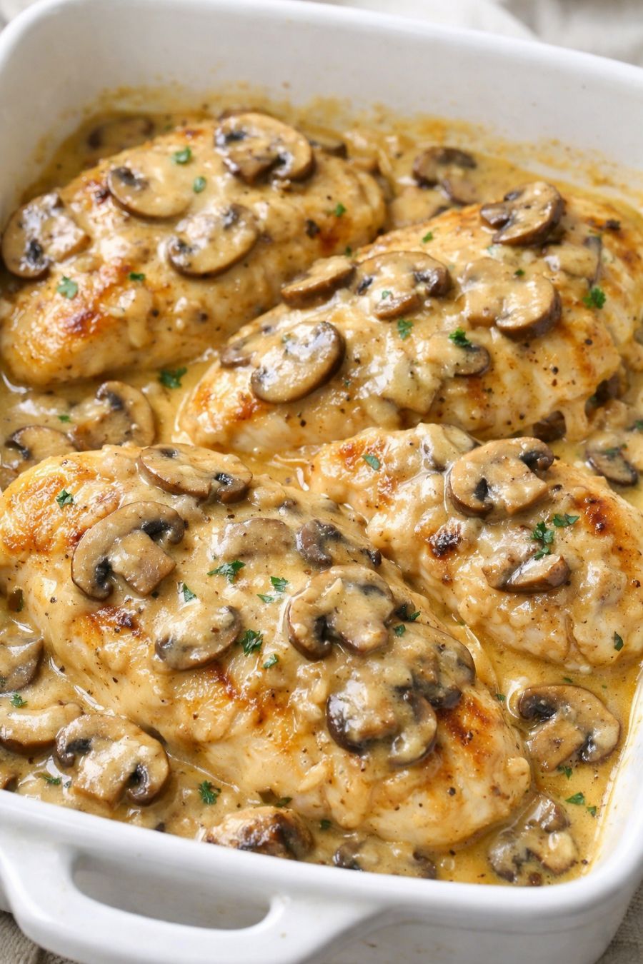Carefully remove the foil and spoon some of the hot mushroom gravy over the tops of the chicken breasts. If you’d like the sauce to thicken slightly and get a bit more golden on top, return the uncovered dish to the oven for an additional 5–10 minutes.