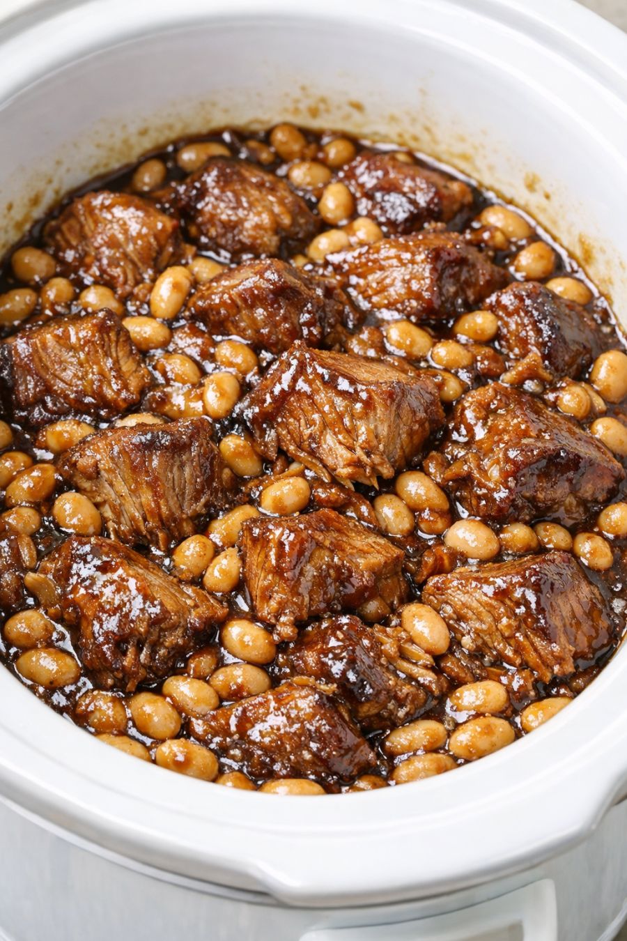 Switch the slow cooker to WARM and let the pork and beans sit for 10 to 15 minutes before serving. This short rest allows the beans to absorb more of the molasses-rich sauce and gives the surface that shiny, clinging glaze you want.