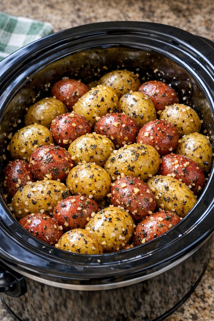 Once the potatoes are tender, give them a gentle stir to redistribute the seasoned oil and any browned spots from the edges of the crock. Taste one potato and adjust with a pinch more salt or pepper if desired (pepper is optional and not counted among the core pantry staples).