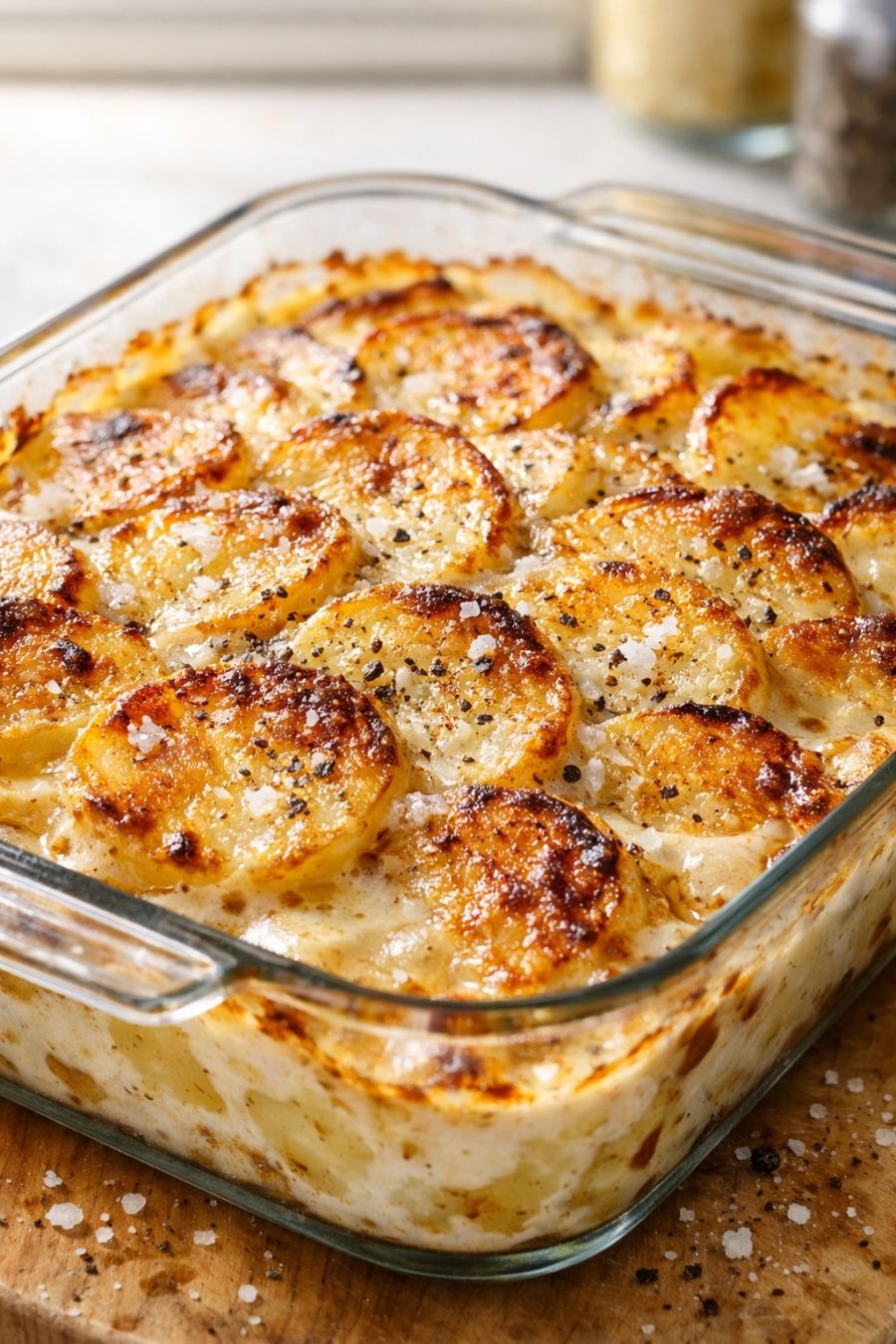 Once done, remove the dish from the oven and let the scalloped potatoes rest for at least 10–15 minutes before serving. This short rest helps the sauce thicken up a bit and makes it easier to scoop neat portions. Serve warm right from the glass baking dish at the table so everyone can see the pretty overlapping potato rounds.
