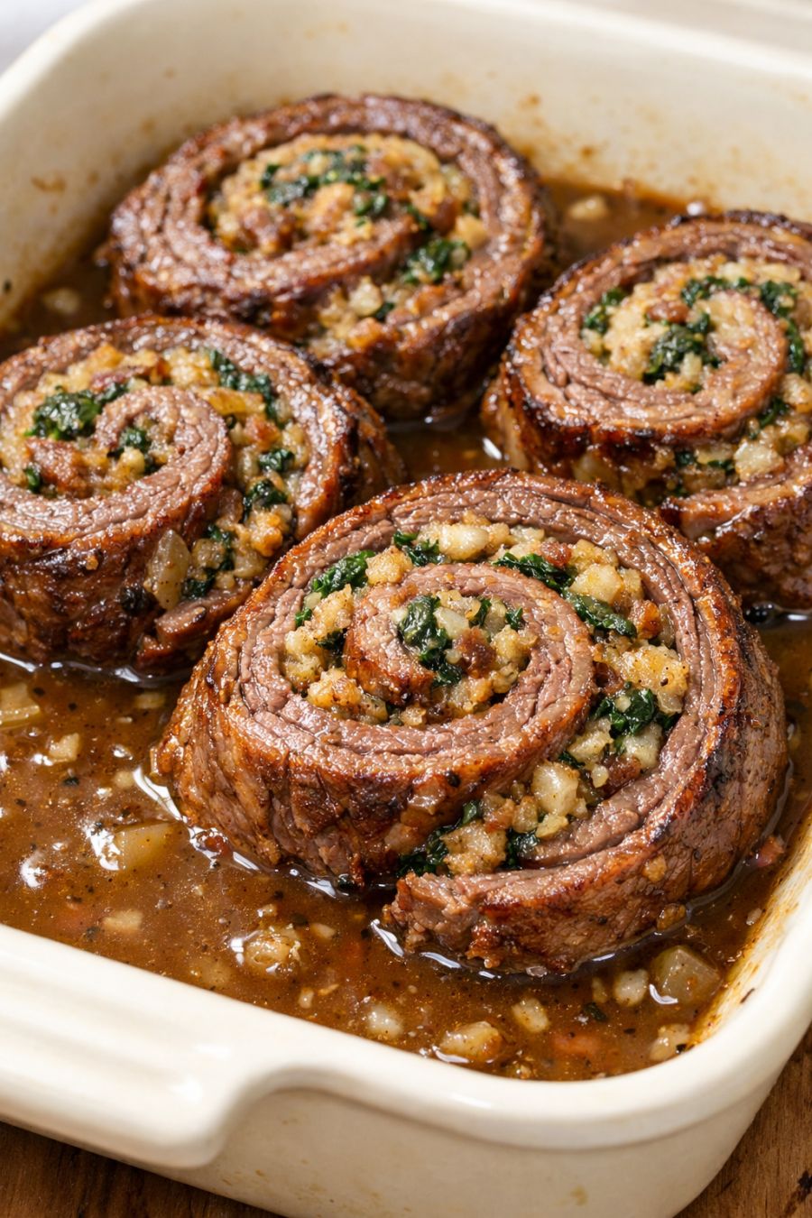 Remove the foil and continue baking for another 20–25 minutes, or until the pinwheels are cooked through (no pink in the beef), the tops are golden brown, and the gravy is bubbling. Total baking time is about 45–50 minutes.