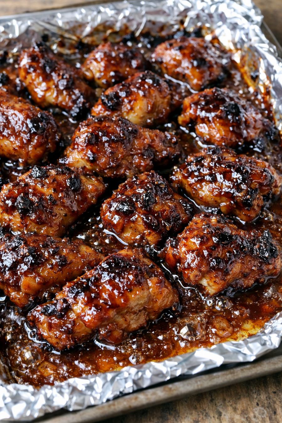 Transfer the pan to the preheated oven and bake for 45 to 55 minutes, or until the chicken is cooked through (internal temperature reaches 165°F/74°C in the thickest part) and the skin is dark, sticky, and deeply glazed. The sauce around the chicken should be thickened and bubbling.