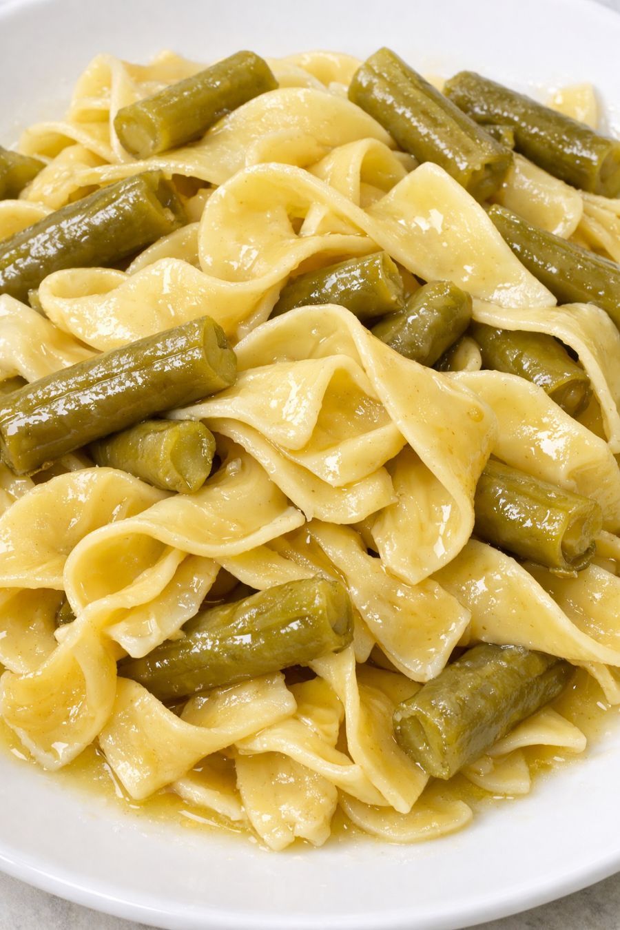 Serve these buttery green bean noodles heaped into warm bowls or onto simple white plates so you can really see the golden noodles and soft green beans. Around here, we like it with sliced fresh tomatoes in summer or a little side of applesauce in winter. A crisp green salad with a tangy vinaigrette helps cut through the richness, and if you’ve got it, a piece of buttered bread or a warm dinner roll is perfect for swiping up the extra sauce. A glass of cold milk or sweet tea fits right in with this old-fashioned, payday-eve kind of meal.