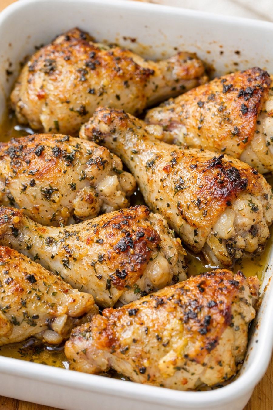 Place the baking dish on the middle rack of the preheated oven. Bake for 35 to 45 minutes, depending on the size of your chicken pieces, until the skin is deep golden and lightly crisped around the edges and the internal temperature reaches 165°F (74°C) in the thickest part without touching the bone.