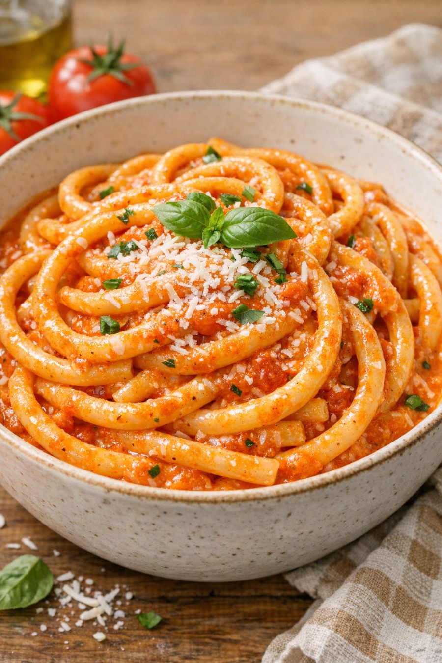 Once the pasta is cooked to your liking, give everything a final stir, taste, and if you like, adjust the seasoning at the table with salt and pepper. Serve the bucatini hot, spooning plenty of the creamy tomato sauce over each portion.