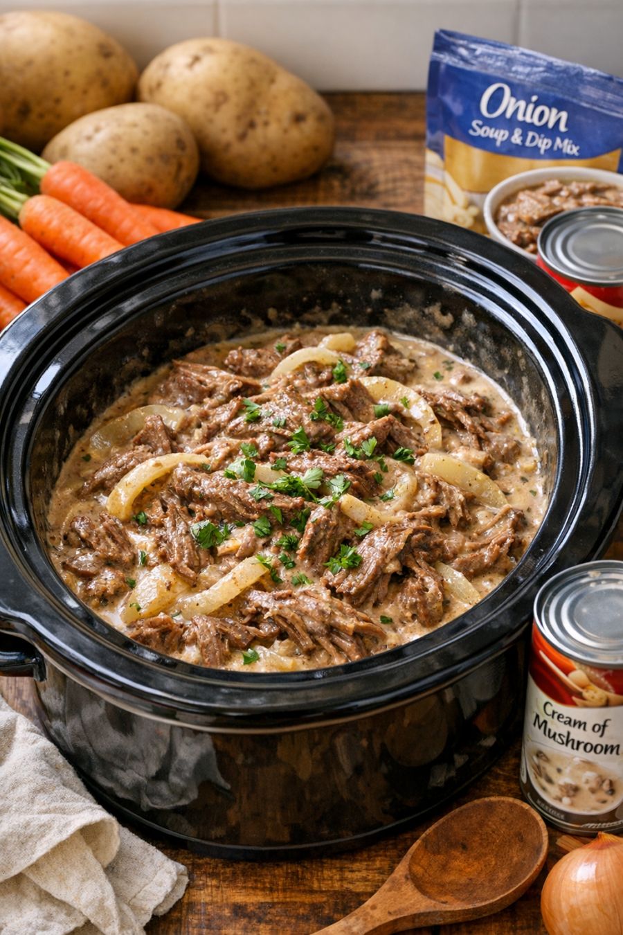For a slightly lighter version, swap the cream of mushroom soup for cream of chicken or cream of celery; the texture will be similar, but the flavor changes just enough to feel new. If you like a little kick, add 1 to 2 teaspoons of prepared horseradish or a pinch of red pepper flakes to the soup mixture before pouring it over the roast. To stretch this meal for a bigger crowd, add 1 to 2 cups of baby carrots and thick-sliced onions around the frozen roast before cooking—no extra seasoning needed. If you prefer a thicker gravy, remove about 1/2 cup of the hot cooking liquid at the end, whisk it with 1 tablespoon cornstarch, then stir it back into the slow cooker and let it simmer on HIGH for 10 to 15 minutes. For make-ahead meal prep, cook the beef a day in advance, chill it in the fridge right in the crock, then reheat on LOW until warmed through; the flavors deepen overnight and it’s one less thing to think about on a busy holiday weekend.
