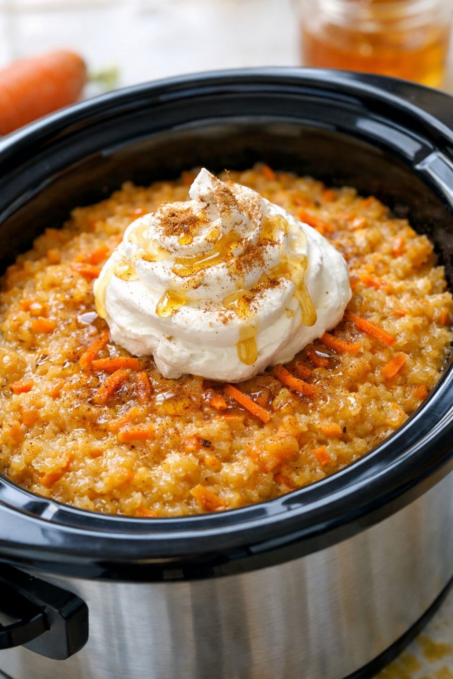 For kids who are hesitant about visible carrots, you can shred the carrots extra fine or even pulse the shredded carrots a few times in a food processor so they melt into the pudding more. If your family loves traditional carrot cake, add 1/2 cup of raisins and 1/2 cup of chopped walnuts or pecans over the carrot layer before adding the cake mix. To make it taste more like a spice cake, increase the cinnamon to 2 teaspoons and add a pinch of nutmeg and ginger if you have them. For a slightly less sweet version, use only 3/4 of the can of sweetened condensed milk and add 2 to 3 tablespoons of regular milk to keep the moisture. You can also swap the yellow cake mix for a spice cake mix and skip the added cinnamon. If you need to keep it warm for a party, switch the slow cooker to the WARM setting once it’s done; it will hold nicely for an hour or two—just keep the lid on so it doesn’t dry out. And if you have leftovers, refrigerate them in a covered container; reheat individual portions in the microwave and serve with a little extra cream or ice cream to bring back that just-cooked coziness.