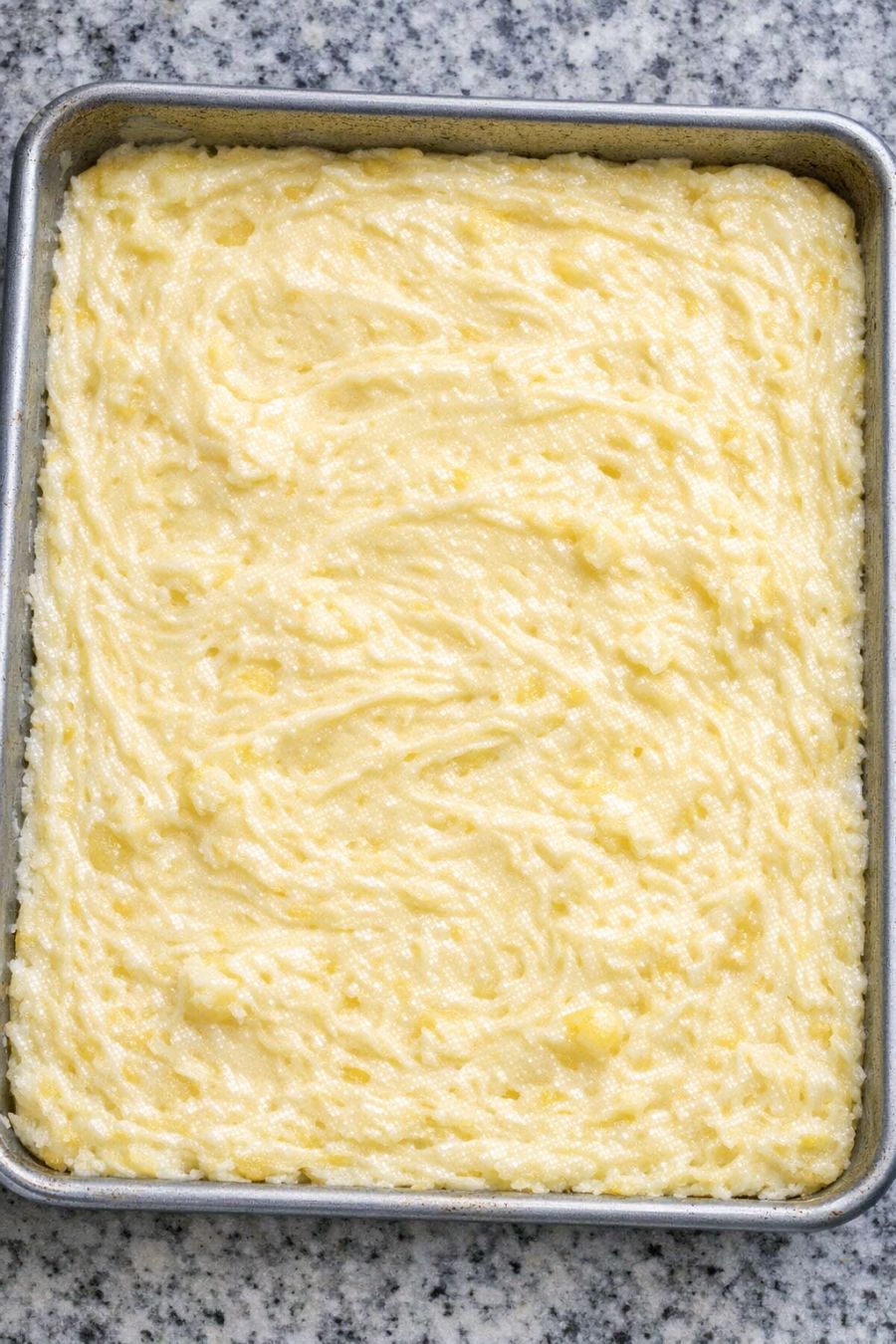 Transfer the batter to the prepared 9x13-inch metal pan. The batter will be quite thick; use a spatula to spread it into the corners. Then, lightly drag the spatula in loose swirls across the top so the surface looks slightly uneven and textured—that’s what gives the baked cake its homey, swirled appearance.