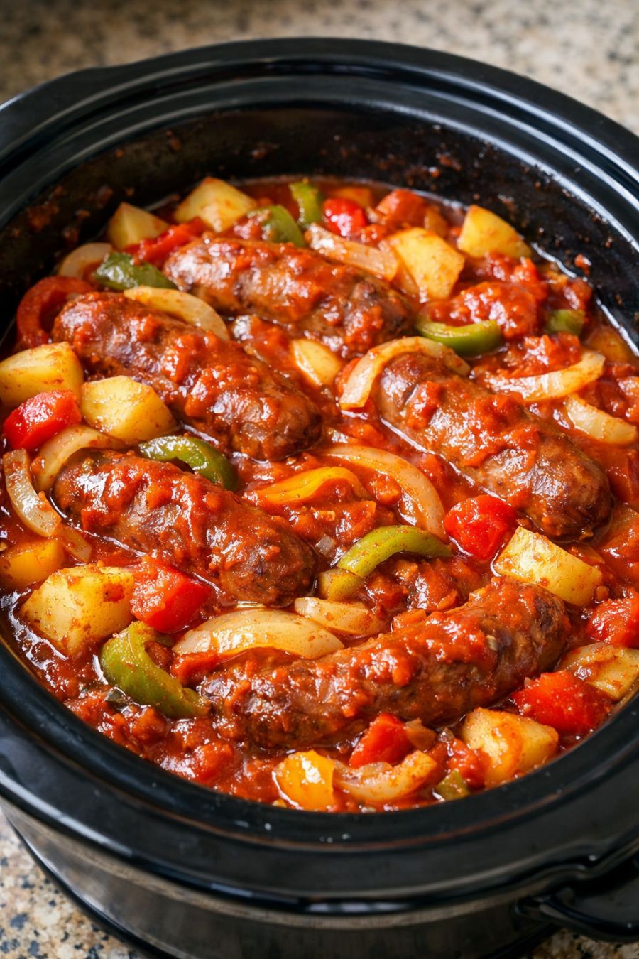 Cover the slow cooker with the lid and cook on LOW for 6–8 hours, or on HIGH for 3–4 hours, until the sausages are cooked through, very tender, and the onions are soft and sweet. During cooking, the sausages will release juices and the sauce will thin, then thicken again into a rich gravy.