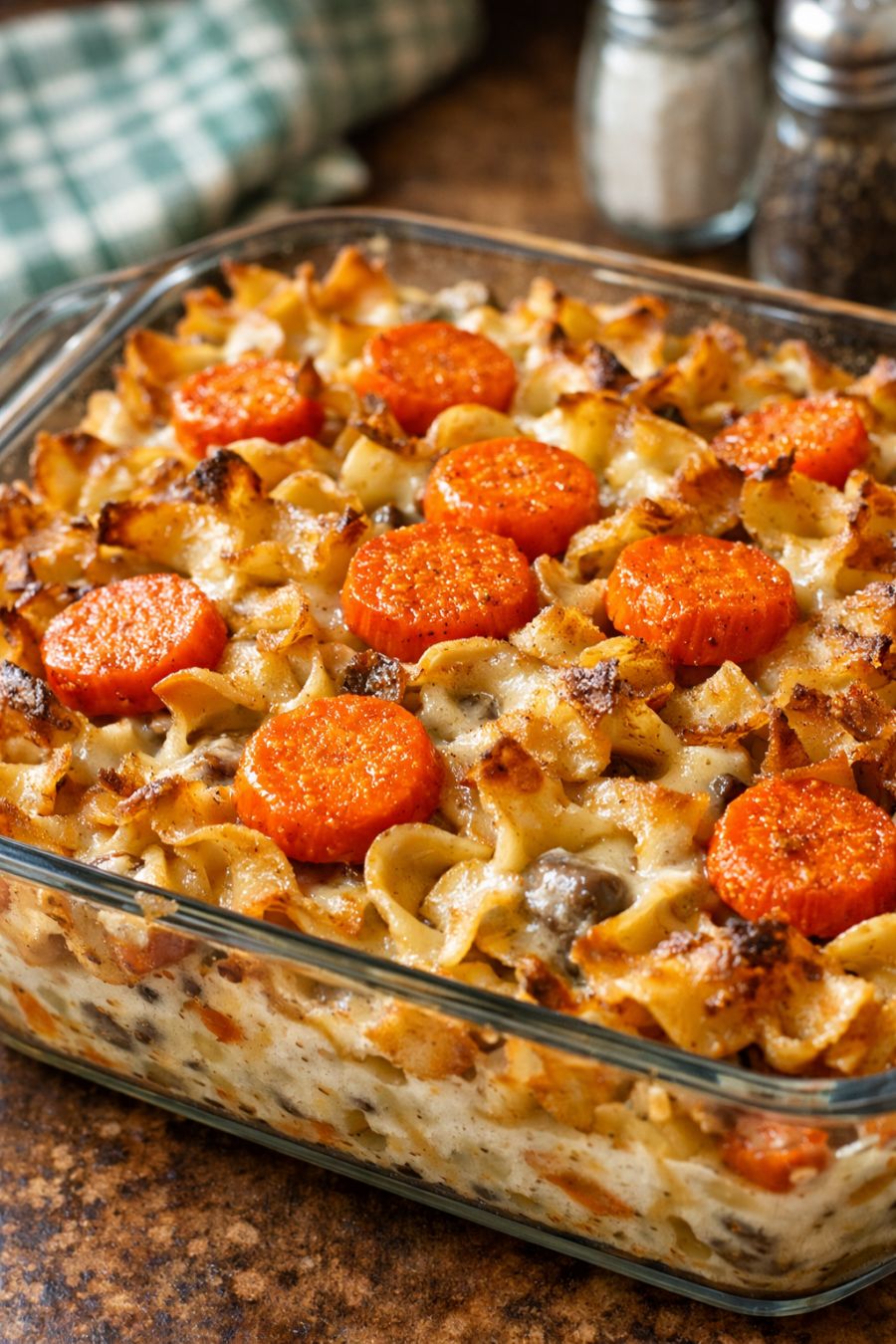 To add a little more protein on busy nights, stir in 1–2 cups of cooked, shredded chicken or diced ham when you’re mixing the carrots and noodles in the glass baking dish. If you like a bit of extra richness, swap half of the milk for half-and-half or add a small handful of shredded cheddar cheese on top for the last 10 minutes of baking. For a slightly different flavor profile, you can use cream of chicken or cream of celery soup instead of cream of mushroom. If you’re trying to get more veggies in, toss in a cup of frozen peas or corn (no need to thaw) along with the carrots. To keep the noodles from drying out when reheating leftovers, stir in a tablespoon or two of milk before microwaving and cover the dish so the moisture stays in. And if you’re meal-prepping, you can assemble the casserole in the glass baking dish earlier in the day, cover it, refrigerate, and then bake it that evening, adding 5–10 extra minutes to the covered bake time since it will be starting cold.