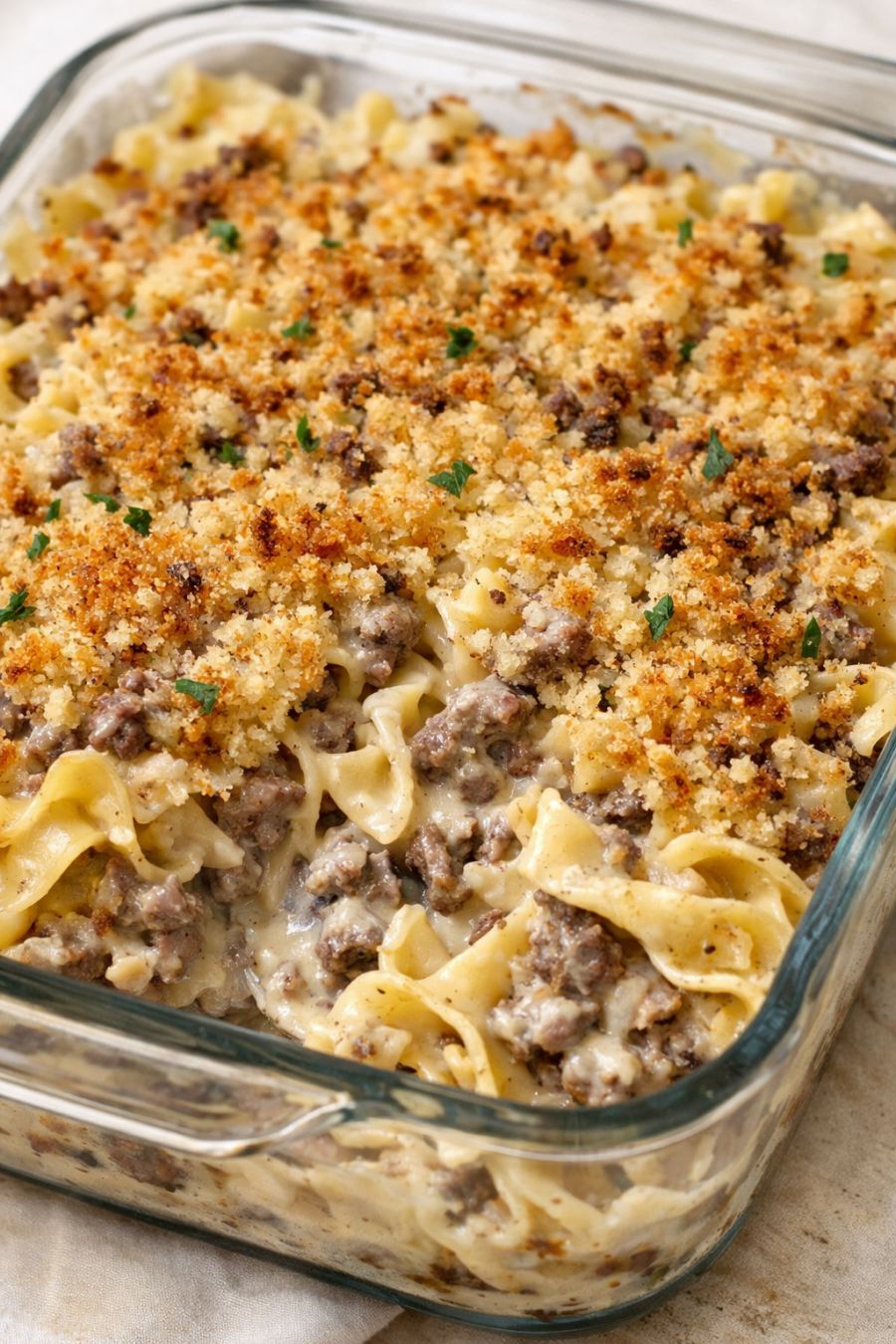 To keep the spirit of the 4-ingredient recipe, think of these as optional tweaks you can use when you have a little extra time or pantry odds and ends. For a slightly different flavor, swap one can of cream of mushroom soup for cream of chicken or cream of celery. If you like a bit more texture, stir a handful of frozen peas or corn into the beef and noodle mixture before baking (this technically adds another ingredient, but it’s a nice way to sneak in veggies). You can also mix half seasoned breadcrumbs and half crushed butter crackers for a more buttery topping. For a lighter version, use extra-lean ground beef and reduced-fat condensed soup. To meal prep, assemble the casserole the night before, cover tightly, and refrigerate; add an extra 5–10 minutes to the bake time if you’re starting from cold. Leftovers reheat well in the oven at 325°F, covered with foil, or in the microwave with a splash of water to keep everything creamy.