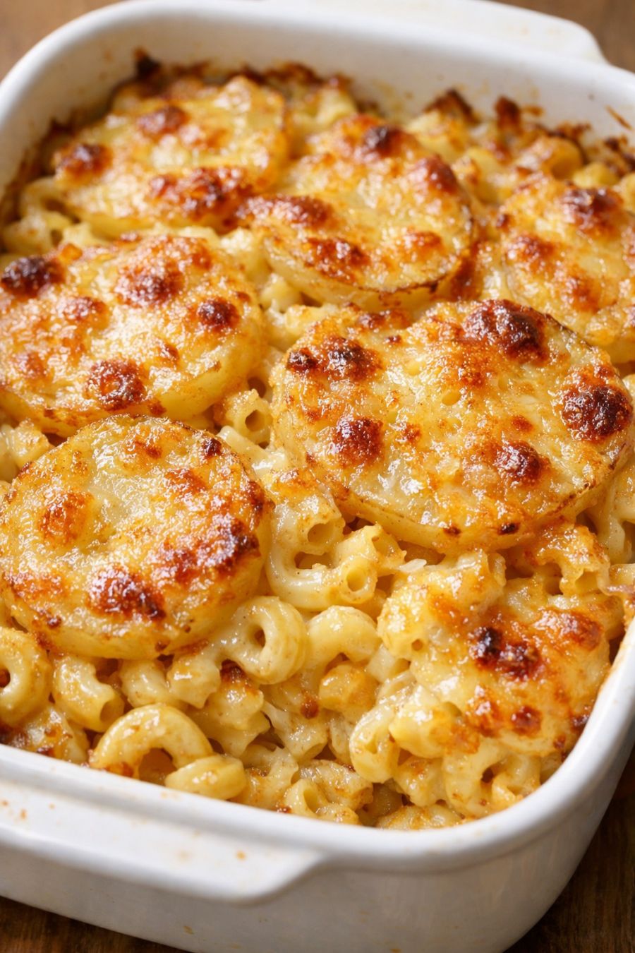 Remove the casserole from the oven and let it rest for at least 10–15 minutes before serving. This short rest helps the creamy sauce thicken up a bit so each scoop holds together and you get that perfect mix of macaroni, potatoes, and cheesy crust in every serving.