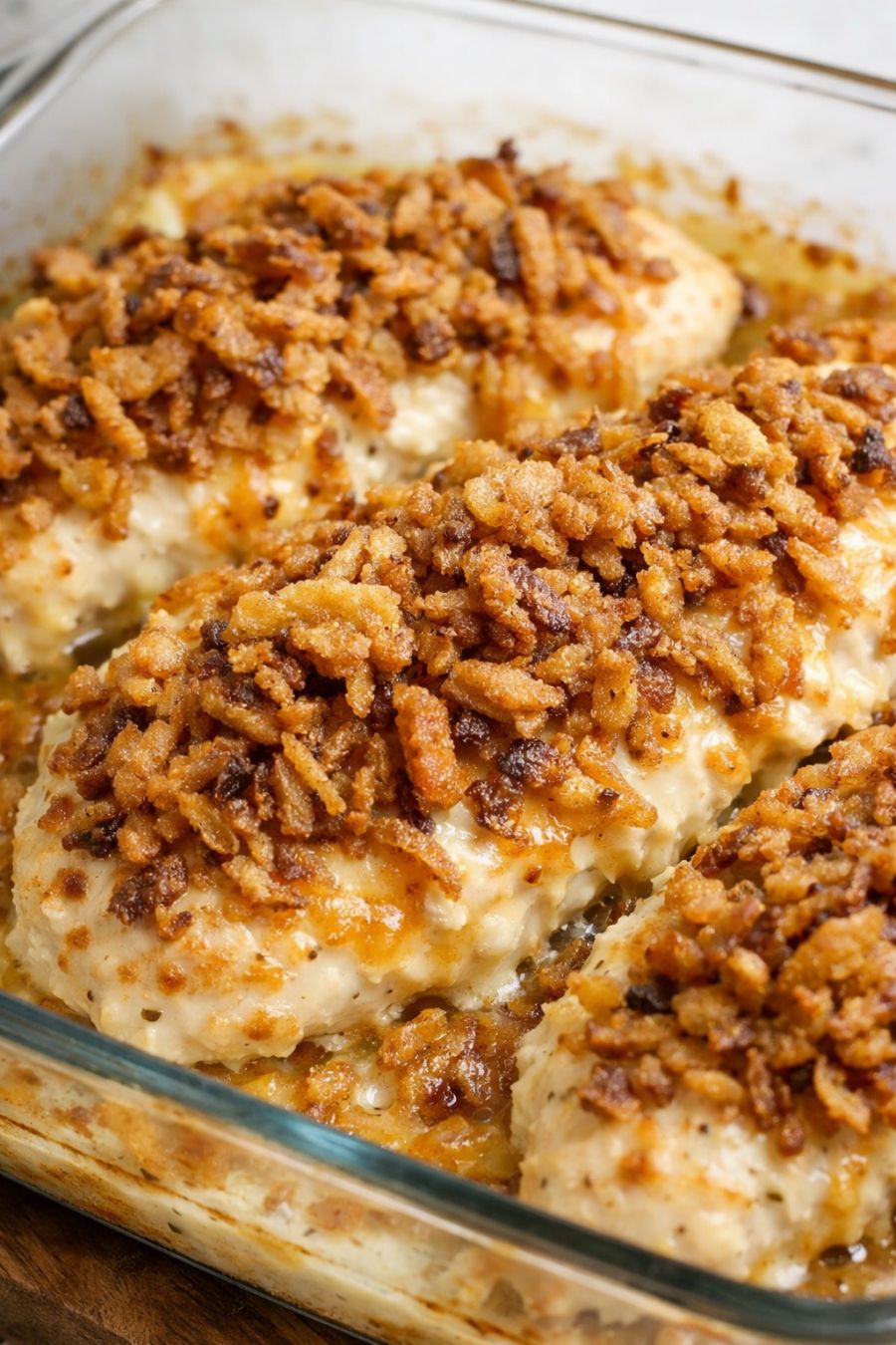 Let the chicken rest for about 5 minutes before serving so the sauce thickens slightly. Serve straight from the glass baking dish, making sure to spoon plenty of the crispy onions and creamy sauce over each piece.