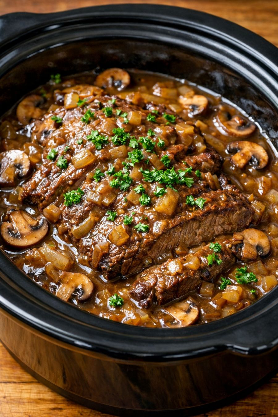 Once the beef is tender, use two forks to shred it right in the slow cooker, pulling it into bite-sized pieces and mixing it into the onion-mushroom gravy. Taste and add a pinch of salt or pepper if needed, depending on how salty your broth and soup mix are.