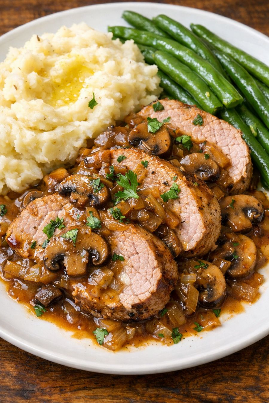 Serve the sliced pork tenderloin with plenty of the onion-mushroom gravy spooned over the top. It’s wonderful over creamy mashed potatoes, buttered egg noodles, or steamed rice to soak up all the juices. Add an easy green vegetable—roasted green beans, sautéed spinach, or a simple salad with a tangy vinaigrette—to balance the richness. Warm dinner rolls or crusty bread are also perfect for mopping up the extra sauce, turning this minimal-effort dish into a complete Sunday-style meal.