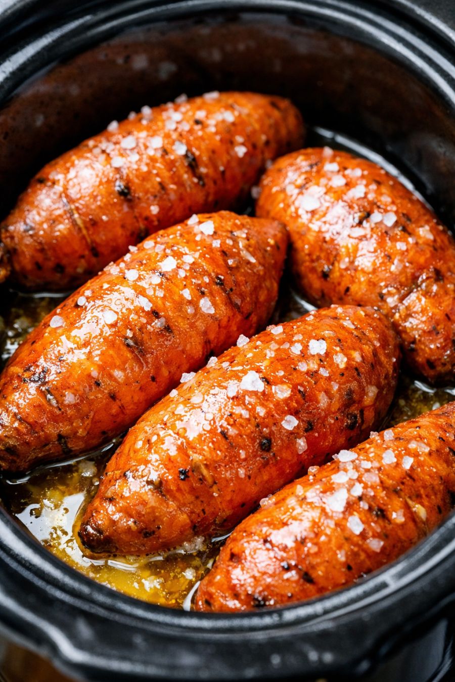 For a touch of sweetness, sprinkle 1 to 2 tablespoons of brown sugar over the potatoes along with the salt before cooking; this leans into a more classic candied-style flavor without adding extra ingredients later. To introduce gentle warmth, add 1/2 teaspoon ground cinnamon or pumpkin pie spice with the salt—this works especially well if you plan to serve the potatoes with roasted meats or as part of a holiday spread. If you only have unsalted butter, use it and increase the salt slightly to taste at the end. For a lighter version, swap half the butter for a drizzle of neutral oil; you’ll keep the moisture and some richness while trimming the cost and saturated fat. If your slow cooker runs hot and you notice the bottoms darkening too quickly, tuck a small sheet of parchment under the potatoes next time to diffuse the heat. Leftovers can be cooled, peeled, and mashed with a spoonful of the cooking butter for an instant mashed sweet potato side, or sliced and pan-seared in a little oil for crispy-edged breakfast potatoes the next morning.