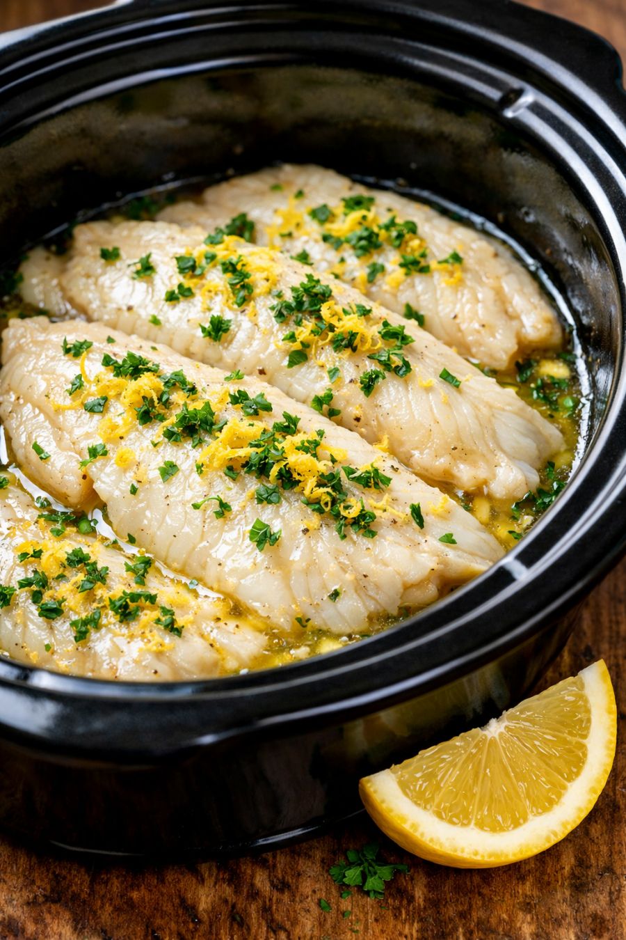 Serve the swai immediately, spooning some of the lemon-butter-herb juices from the bottom of the slow cooker over each portion.