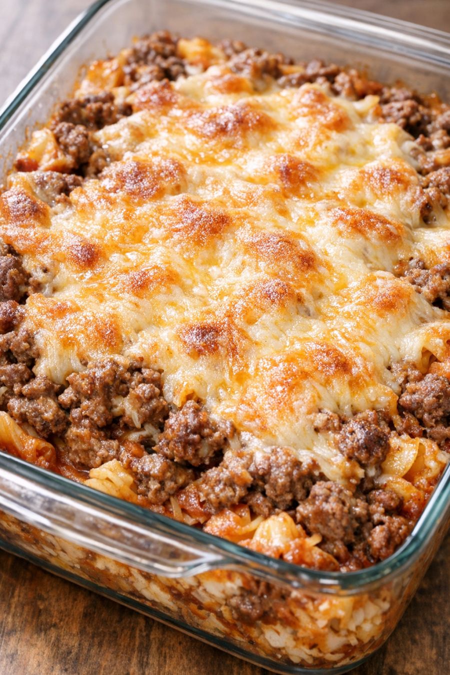 For picky eaters, you can use condensed cream of chicken soup instead of mushroom if they don’t like mushrooms; the bake will still be wonderfully creamy and mild. If your family prefers a little extra flavor, use a sharp cheddar or a mix of cheddar and mozzarella on top for a gooier pull. You can also make this in two 8x8 glass dishes instead of one large one—bake one tonight and refrigerate or share the second with a neighbor or a family from church who could use a night off from cooking. To stretch the meal for a bigger crowd without adding more ingredients, serve it over buttered egg noodles, mashed potatoes, or rice; the creamy beef mixture works almost like a gravy. For make-ahead prep, brown the beef and mix everything together earlier in the day, spread it in the glass dish, cover, and refrigerate. When you’re ready to bake, uncover and add 5–10 minutes to the oven time, watching that the cheese on top melts but doesn’t over-brown.
