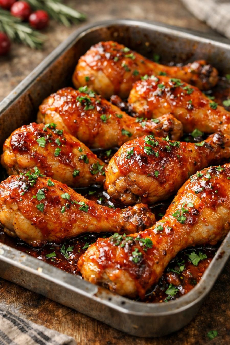 For a spicier version, whisk 1–2 teaspoons of cayenne pepper or crushed red pepper flakes into the glaze before pouring it over the chicken. If you like more tang, add 1–2 tablespoons of apple cider vinegar to the glaze for a sweet-and-sour profile that cuts through the richness. To lean into a more smoky, campfire flavor, substitute half of the barbecue sauce with ketchup and add an extra teaspoon of smoked paprika or a dash of liquid smoke. You can also swap honey for maple syrup for a deeper, woodsy sweetness that feels especially appropriate around fall and winter holidays. If you prefer white meat, the same glaze works well on bone-in, skin-on chicken thighs or drumsticks-and-thighs mixed; just watch the timing and cook until they reach 165°F. For easier cleanup, line the pan with heavy-duty foil before adding the chicken and glaze, but keep using a metal pan if you want that nicely caramelized bottom. Finally, if you’re cooking for a smaller crowd, halve the recipe and use a smaller roasting pan so the glaze doesn’t burn in a wide, shallow layer.