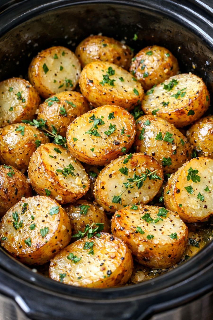 Serve these slow cooker potatoes straight from the crock with a sprinkle of fresh herbs, alongside simple roasted chicken, grilled sausages, or a seared pork chop. They’re also lovely with pan-seared fish or a big leafy salad for a lighter meal. Spoon some of the buttery garlic-herb juices over the top of the potatoes and any protein on the plate. A crisp green vegetable—like steamed green beans or roasted asparagus—balances the richness nicely, and a crusty loaf of bread is perfect for mopping up any leftover sauce.