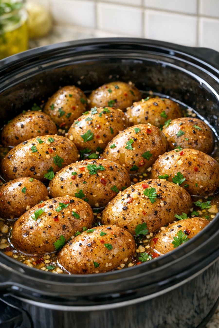 Once cooked, you can serve the potatoes whole, spooning the buttery garlic broth over each serving, or gently mash them right in the slow cooker with a spoon or potato masher to soak up all the flavorful liquid.