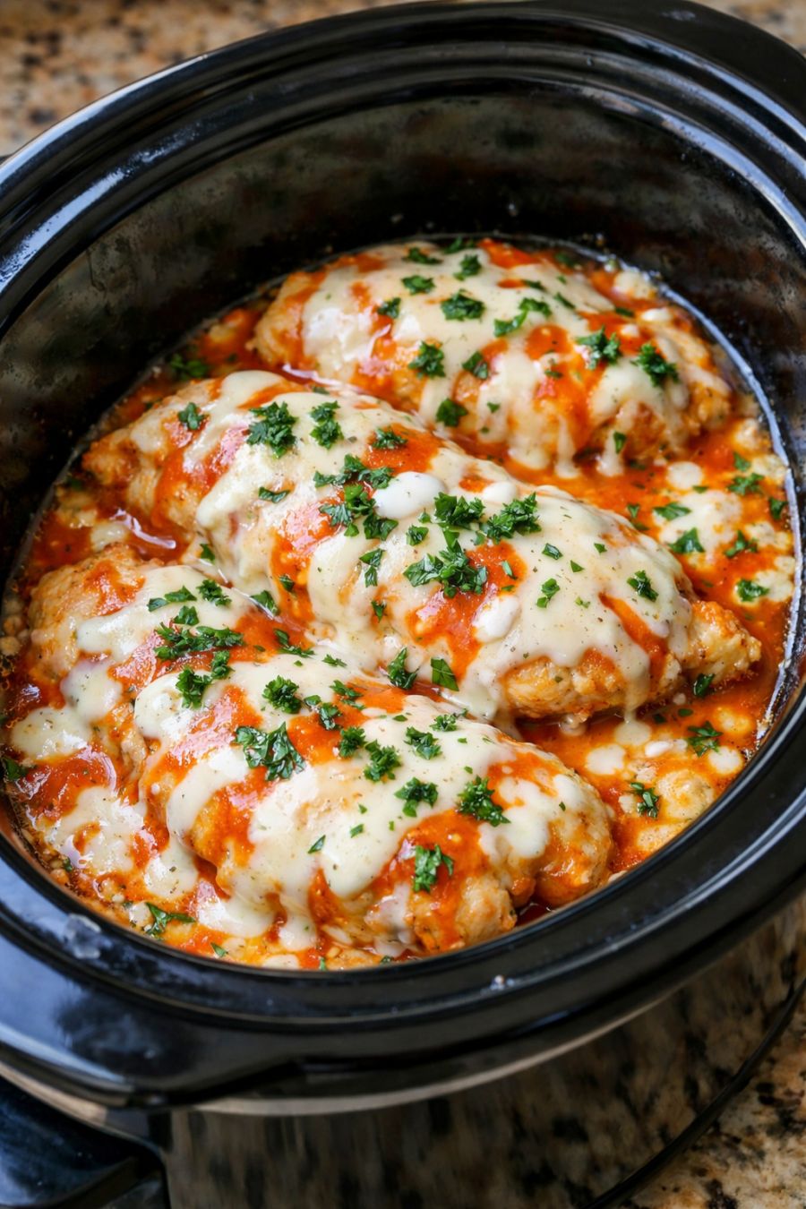 Once the chicken is cooked, sprinkle the shredded mozzarella cheese evenly over the top of the chicken and sauce in the slow cooker.