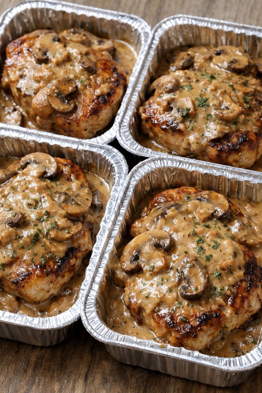 Serve these smothered pork chops right in their foil trays over fluffy mashed potatoes, egg noodles, or steamed white rice so all that creamy mushroom gravy has something to soak into. Add a simple green side like steamed green beans, roasted broccoli, or a tossed salad to balance the richness. Warm dinner rolls or buttered Texas toast are great for mopping up the extra sauce, and if you want to round it out like a classic Sunday supper, finish with something simple and homey like applesauce or a fruit salad.