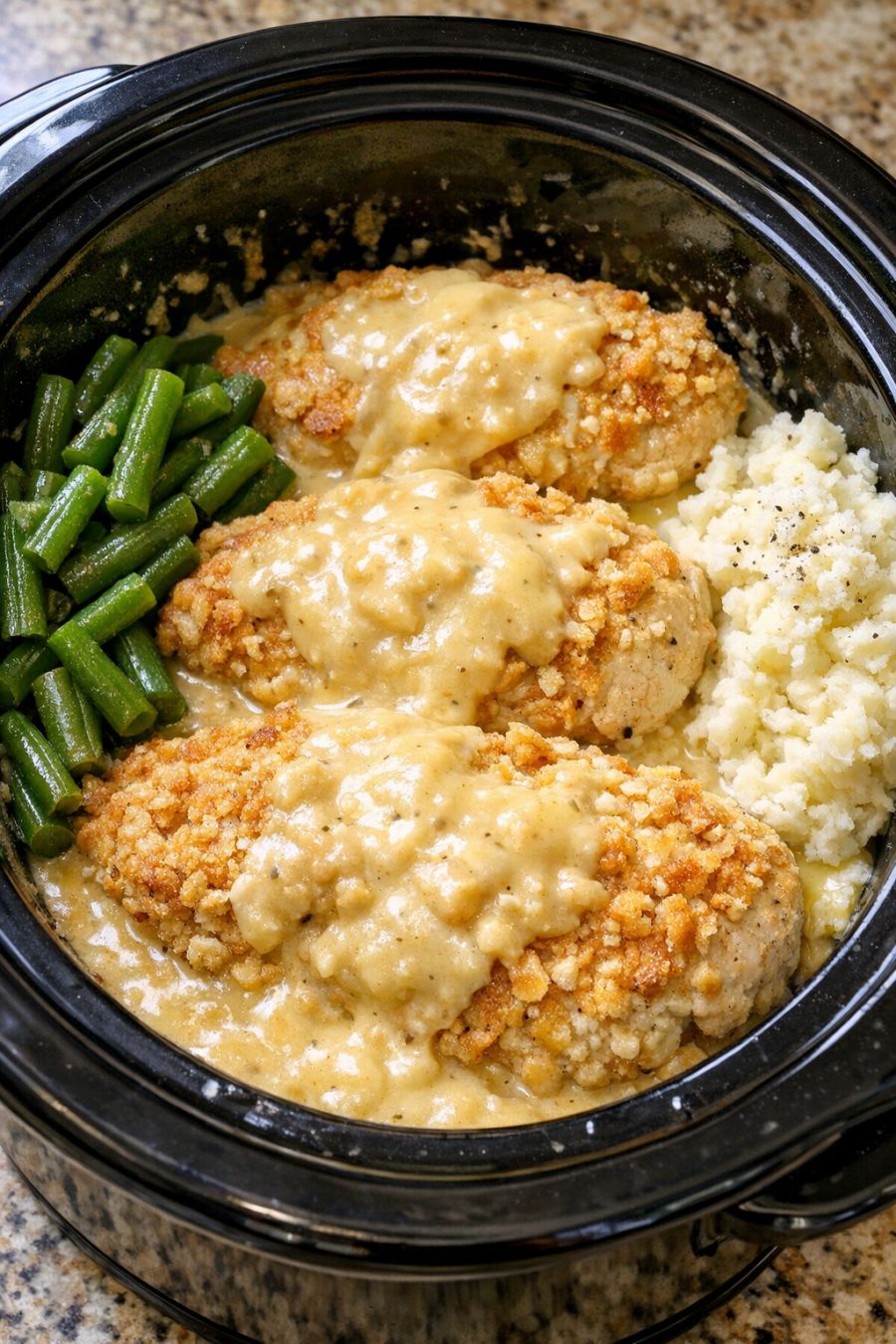 Cover the slow cooker with the lid and cook on LOW for 4 to 5 hours, or until the chicken is cooked through and reaches an internal temperature of 165°F (74°C). The saltine coating will soften and soak up the broth and butter, forming a tender, homey crust and gravy rather than a crisp breading.